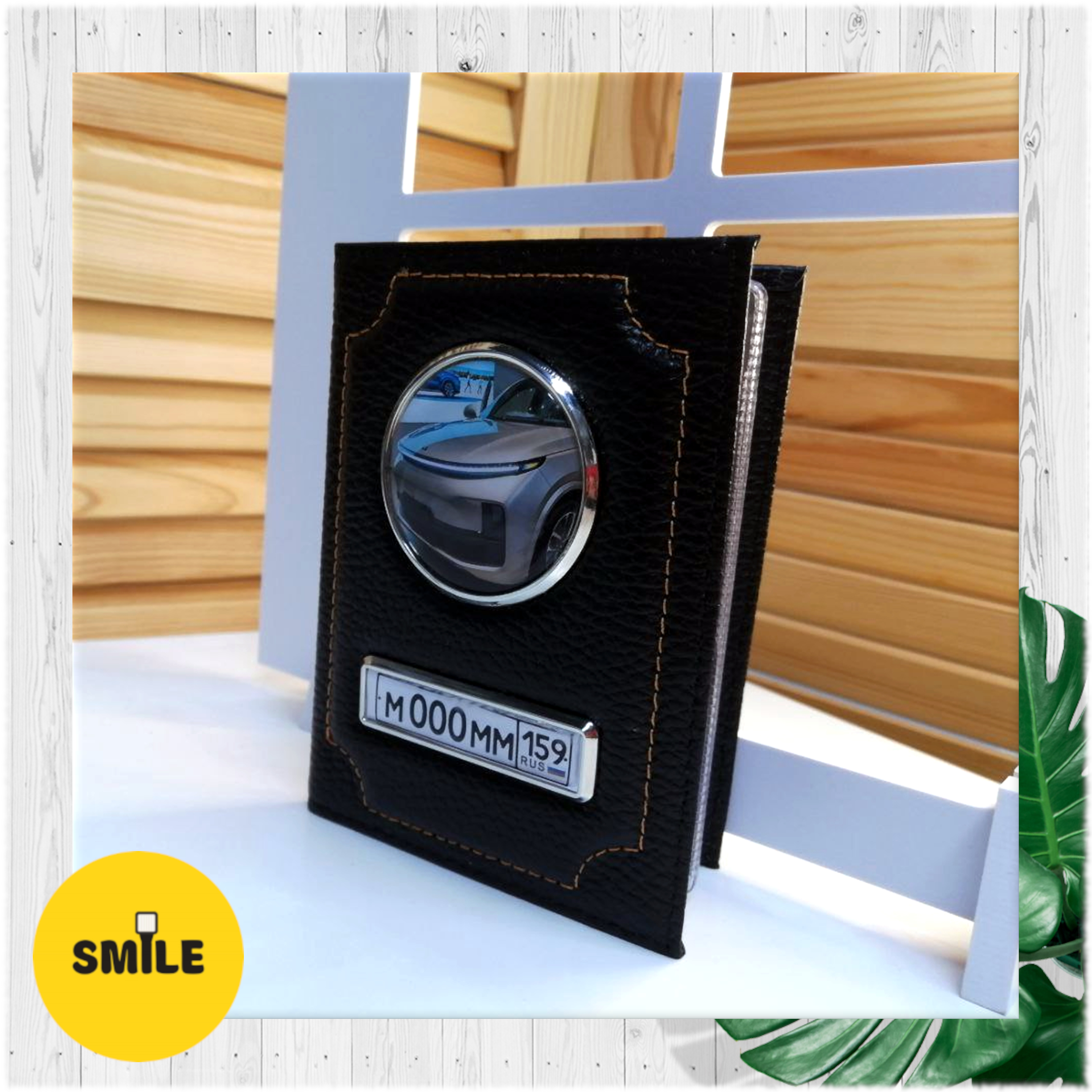 На внешней стороне обложки можно персонализировать изделие, указав марку автомобиля и его государственный номер.